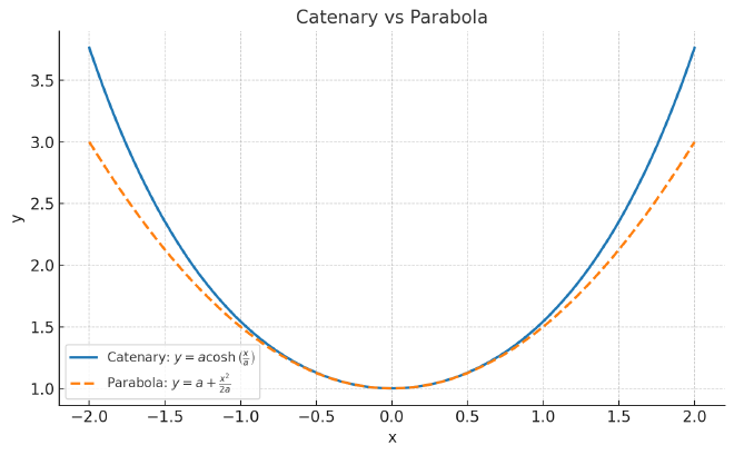 \[y = a\,\cosh\!\left(\frac{x - x_0}{a}\right) + y_0\]where cosh() is the hyperbolic cosine function, which is shorthand for
